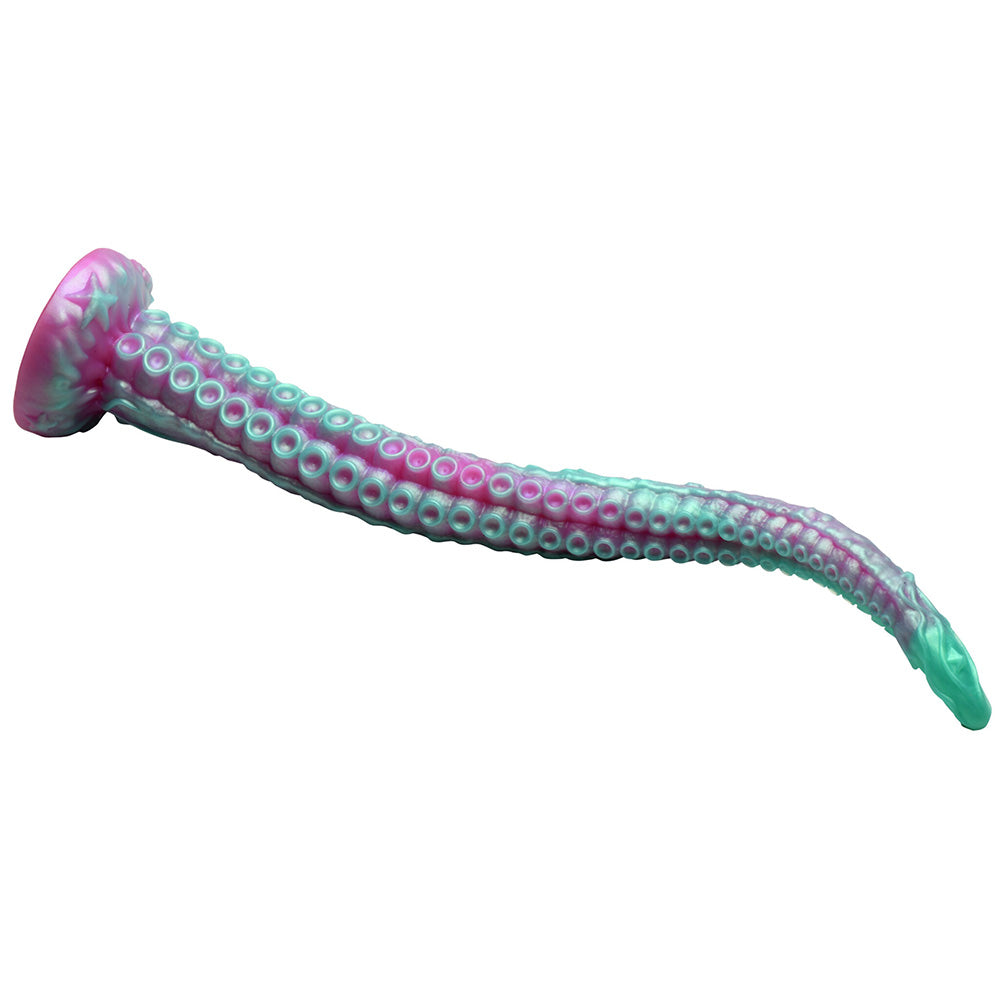 Stimulating Tentacle: This aqua-green and pink tentacle is covered in stimulating textures! Along the long, 17-inch shaft are octopus suckers, starfish, seashells and winding veins, while the tapered tip of the tentacle is lined with grooves for extra stimulating entry!