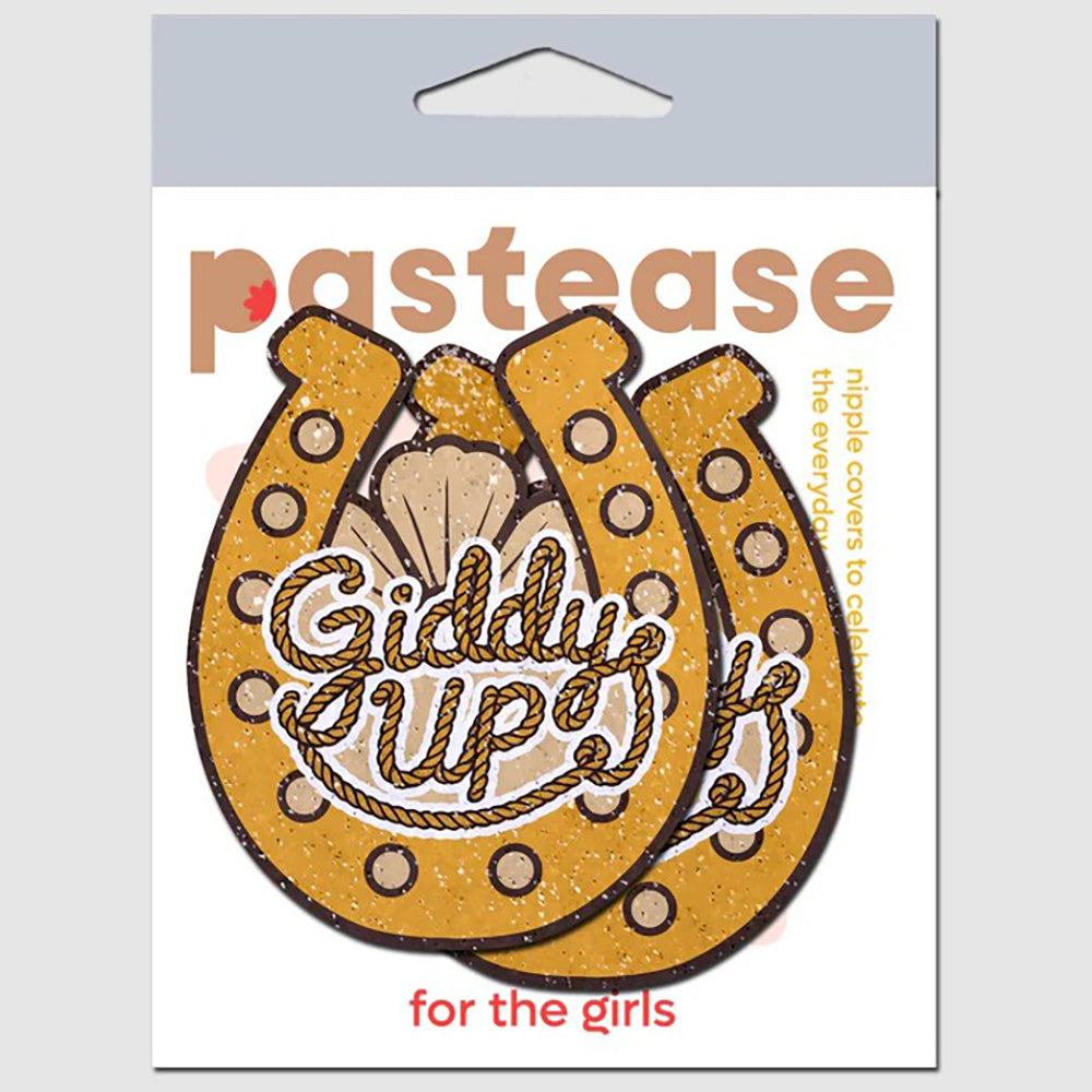 Saddle up for a wild night with these eye-catching Giddy Up Sparkling Horseshoe Golden Nipple Covers. Featuring bold rope lettering and a dazzling golden finish, these 2.5" nipple pasties add a provocative western flair to your festival or country-themed get-up. Perfect for those wild cowgirls looking to turn heads at Night in the Country, Big Sky Festival, Watershed and more! Dimensions: 2.5 x 3" Coverage: 2.5"