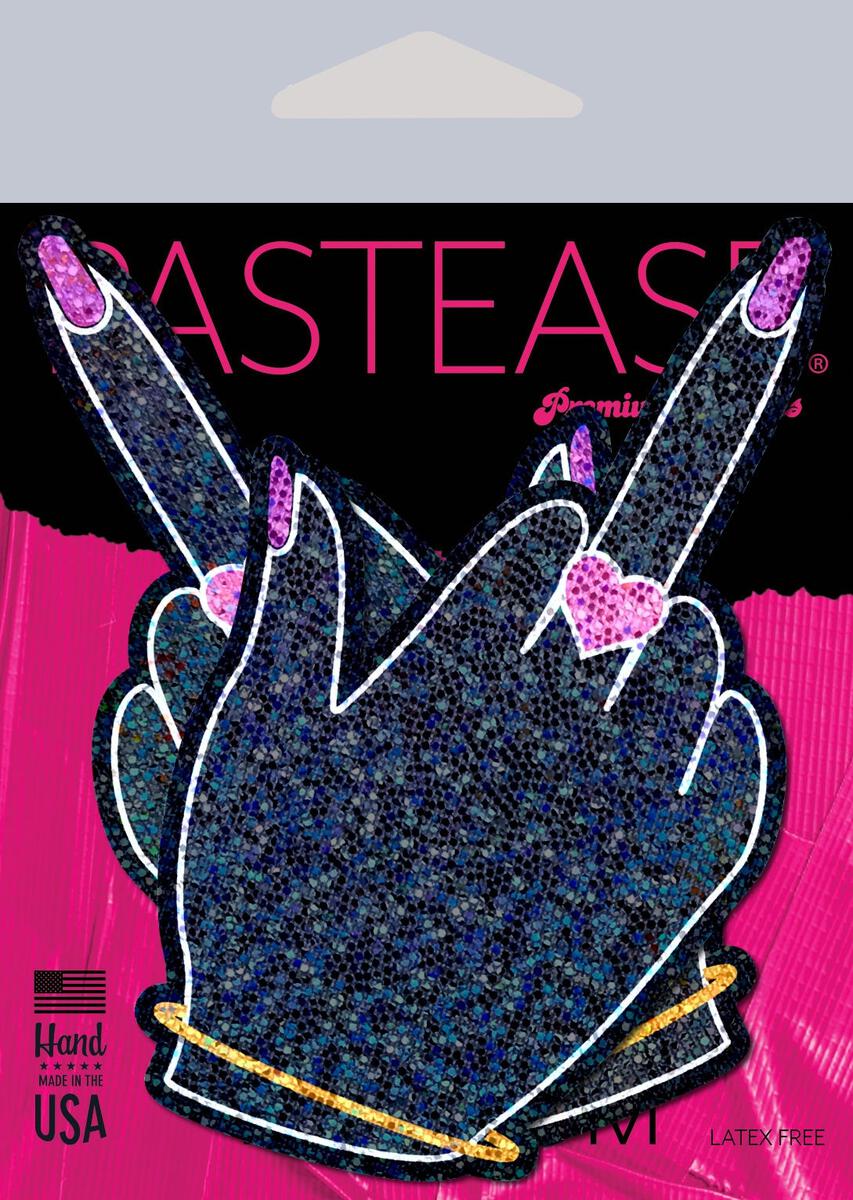 Middle Finger Pasties: Glittering F*ck You Lady Hands Nipple Covers by Pastease® are hand-made in the USA of soft form-fitting material that forms seamlessly to curves and resists wrinkling over hardening nipples.