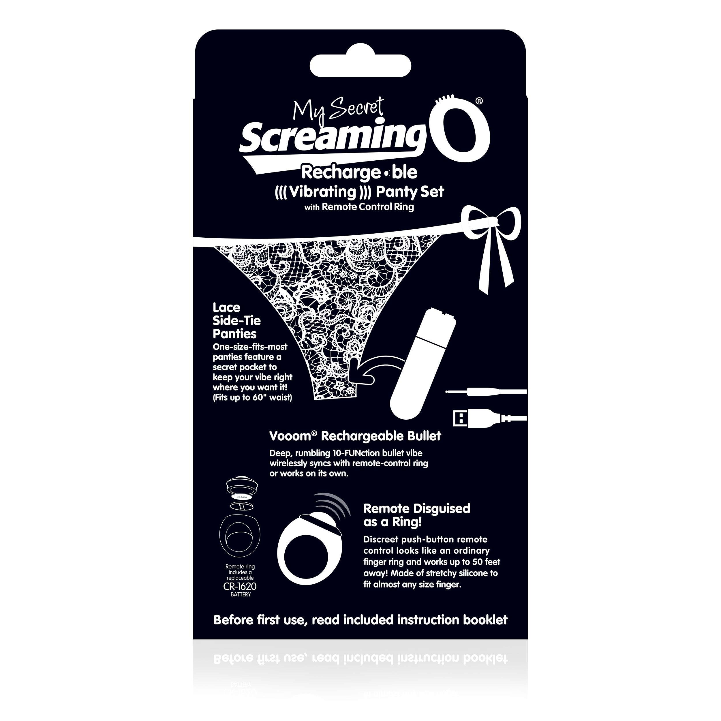 Enjoy a sexy night or play in public with My Secret Charged Remote Control Panty Vibe, a waterproof 10-FUNction rechargeable Vooom® bullet that fits discreetly into a side-tie lace panty. Operated by a remote control cleverly disguised as a finger ring, My Secret Charged Panty features a secret pocket that keeps deep, rumbling vibration right where you want it and fits up to 60-inch waists for a comfortable feel. The discreet push-button remote ring works up to 50 feet away and is made of soft-and-stretchy True Silicone® for easy wear on almost any size finger. Experience deep-rumbling vibration that lasts for more than 60 minutes on a single charge with a body-safe ABS plastic bullet that works with or without the ring and is supported by a 2-year limited warranty. Whether for a tickling tease or some sex-life spice, My Secret Charged Panty inspires connection with a splash of mischief and takes lacey lingerie to a new level.