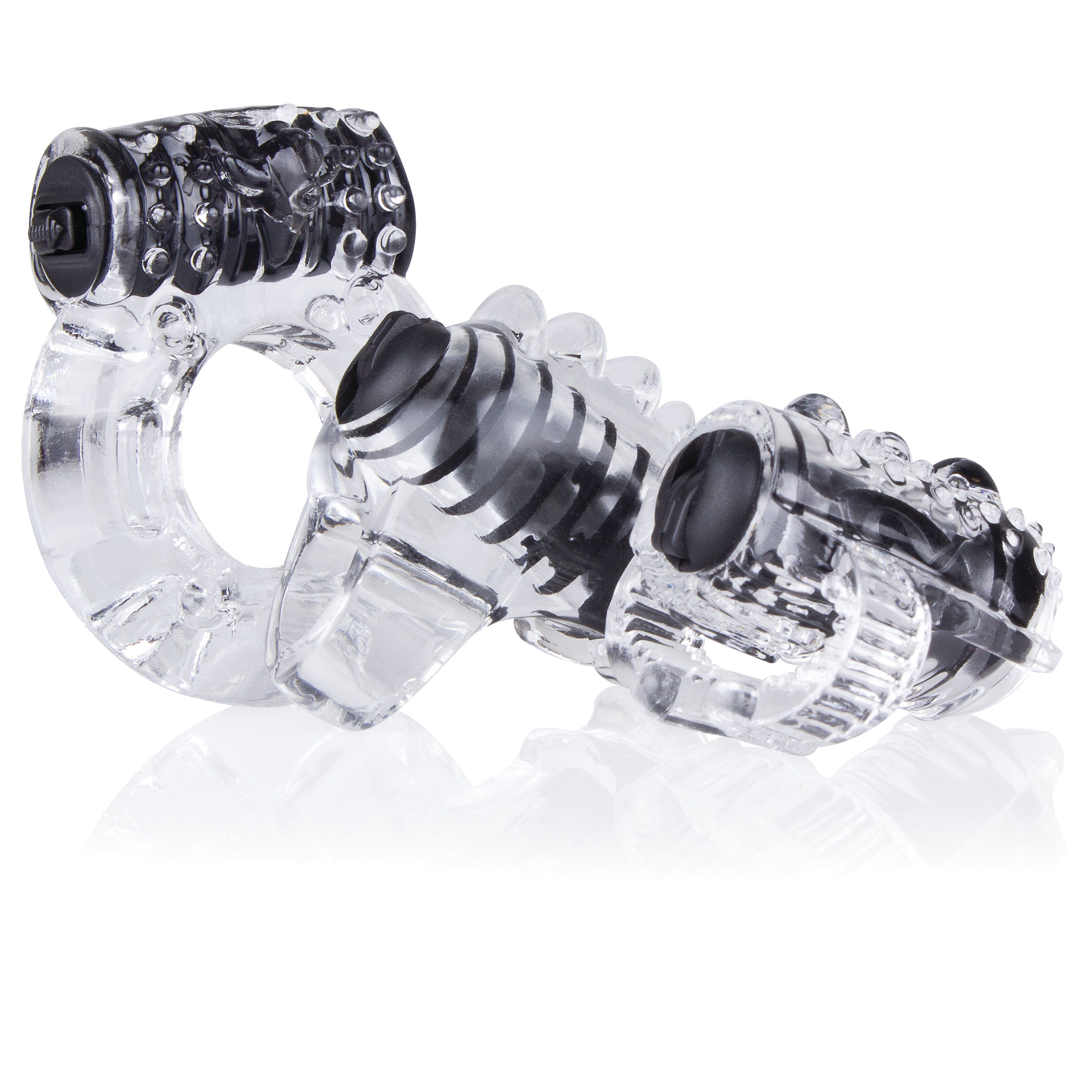 The VibrOman is the ultimate sex toy starter kit for couples exploring vibration in all its forms. This convenient collection offers him a 3-point upgrade with three powerful mini vibes designed to stimulate in very different ways. The mini tongue vibe stretches to fit around his tongue to add a vibrating boost to any cunnilingus session. The mini fingertip vibe sits at the end of any finger and makes it easy to tease, tickle and massage every erogenous zone – especially the clitoris to help orgasms come easier during intercourse! And the vibrating ring makes his whole package vibrate thanks to a super-stretchy ring that fits comfortably around his penis and testicles. When worn with the motor sitting on top, he can stimulate her clitoris with every thrust and intensity her pleasure in some of her favorite sex positions. All three powerful vibrators are made with lab-tested SEBS material for a quality and body-safe experience and are completely disposable, so you can take your VibrOman home or on vacation and leave the evidence behind!