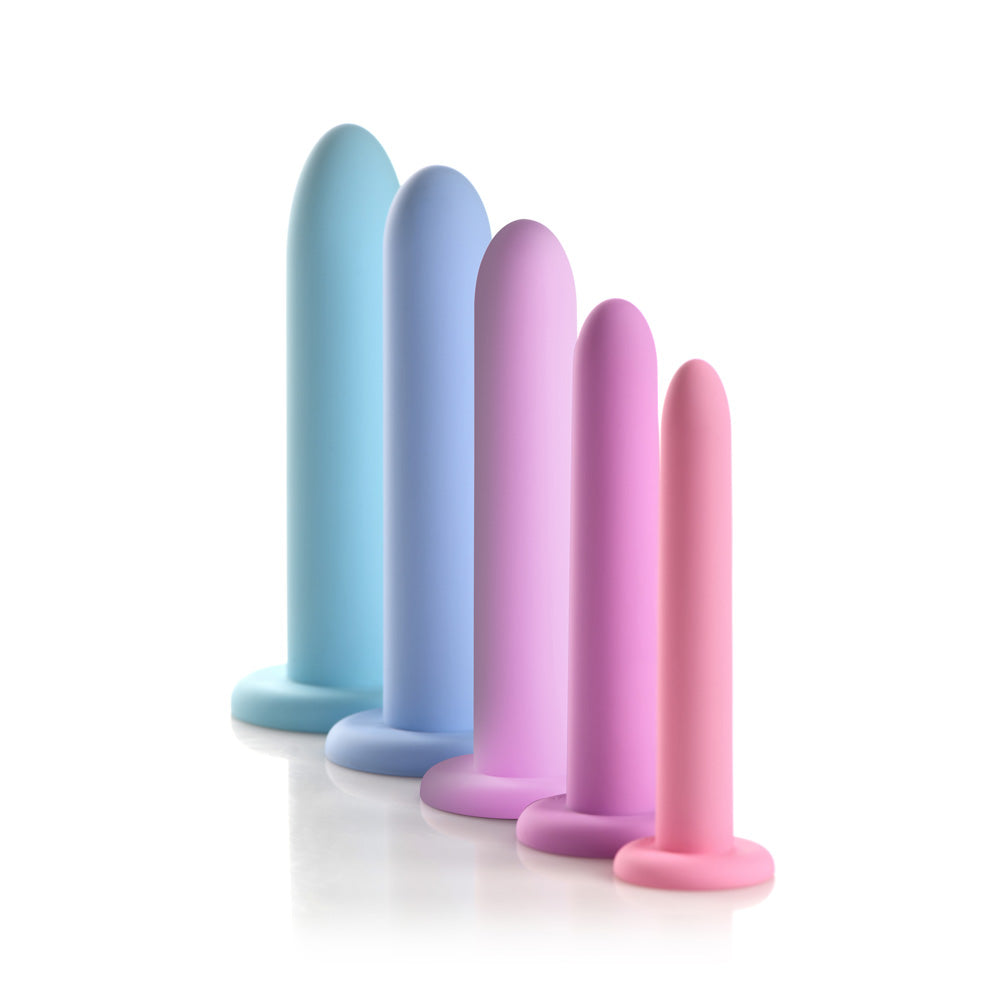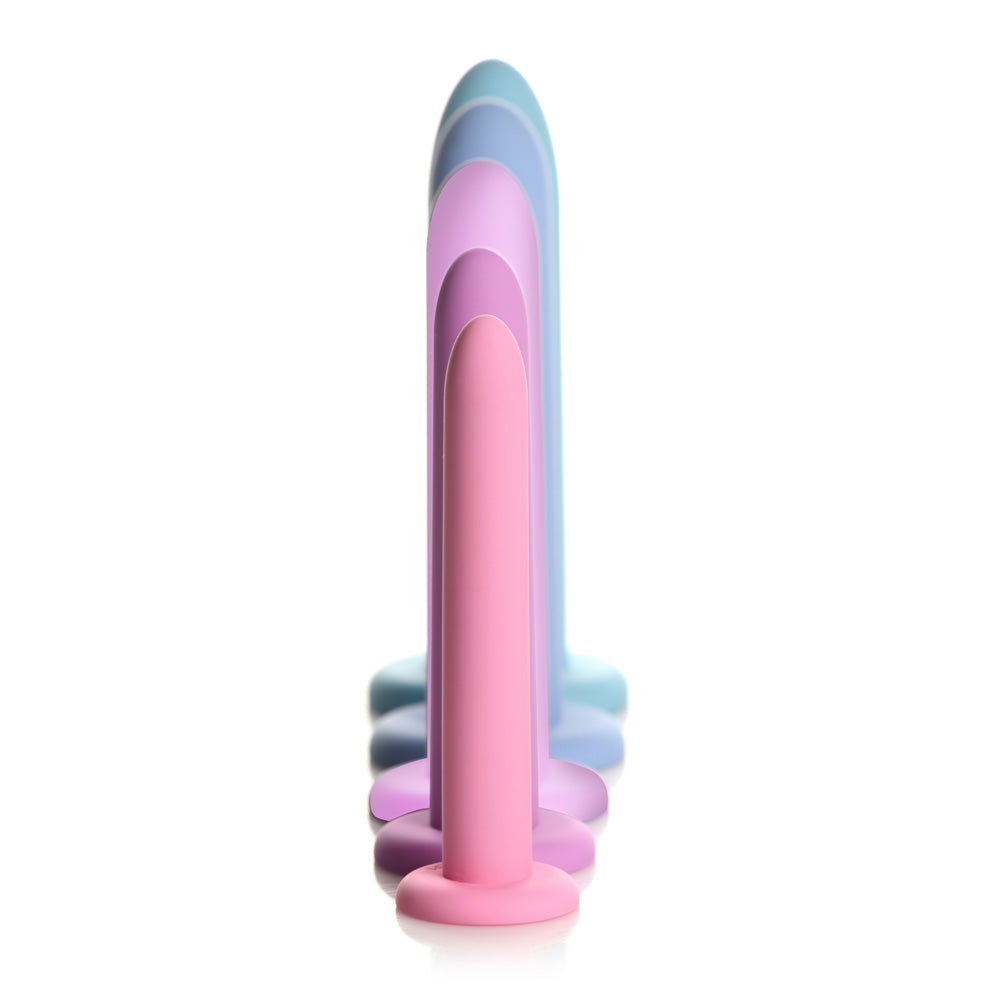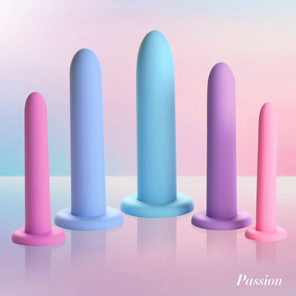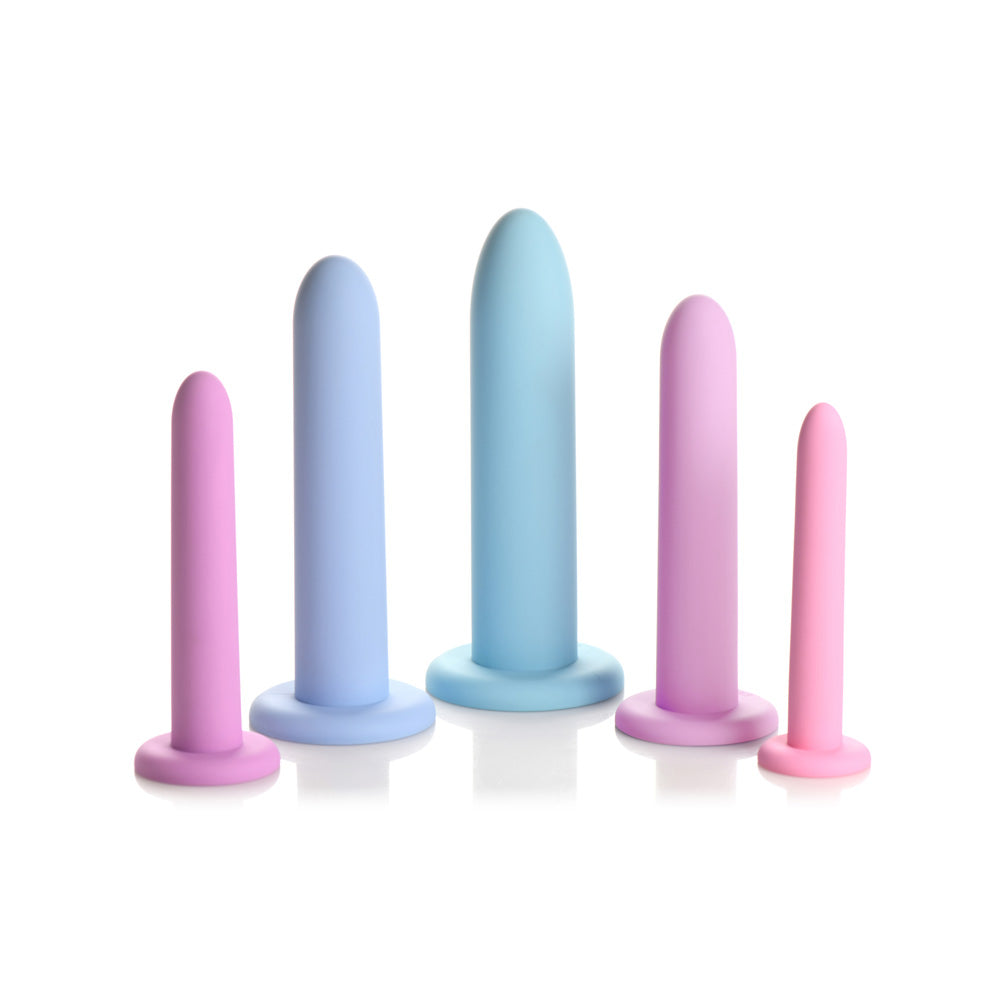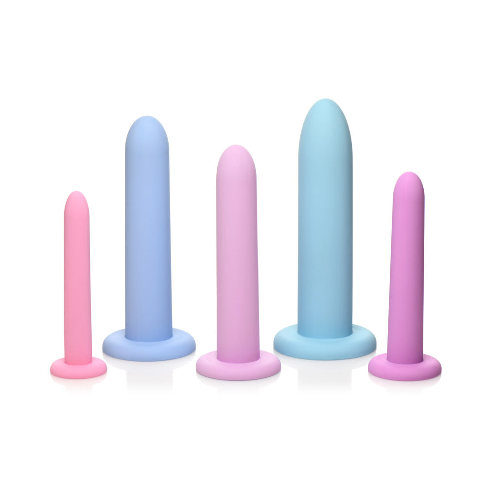 Introducing our premium-quality, body-safe silicone vulva dilator and kegal exercise set. Designed for gentle and comfortable use, each piece is made from silky smooth silicone that glides effortlessly with a touch of water-based lubricant. With five graduated sizes, this set allows you to build your confidence, strength, and control gradually, starting from the smallest size (Step 1) and progressing to the largest (Step 5). The smooth, tapered tip ensures easy insertion, and the suction-cup base lets you enjoy hands-free use on any flat surface. Perfect for those experiencing pain during penetration, these pelvic dilators can help you stretch your pelvic floor muscles and relieve tension effectively. They can be used to relax the muscles or, alternatively, you can squeeze them by doing kegels and strengthen the same pelvic muscles.